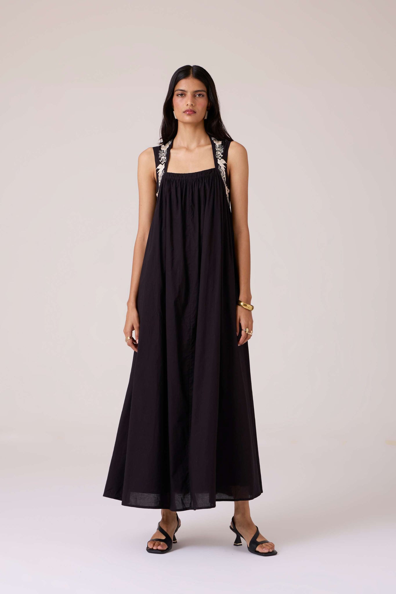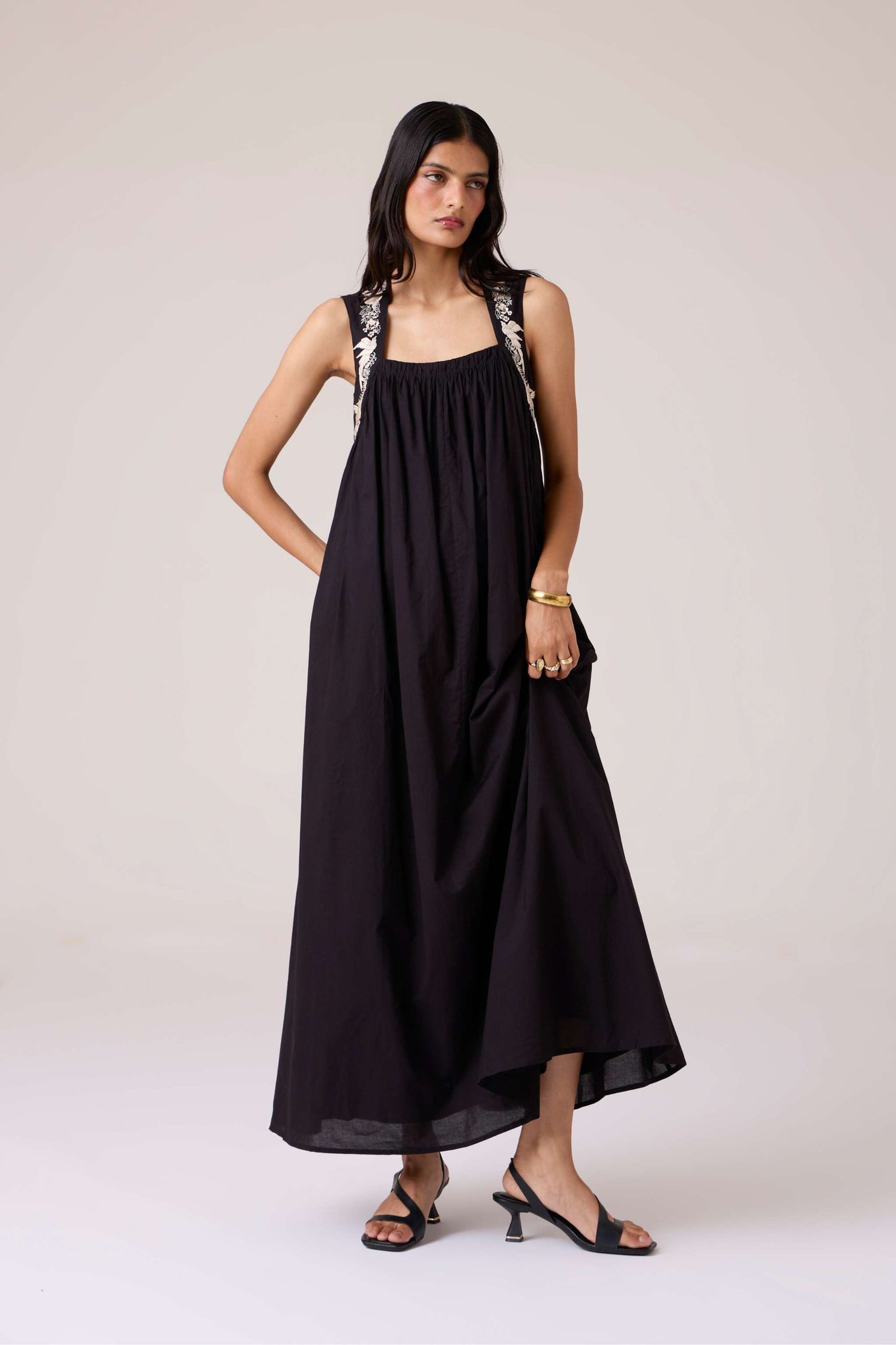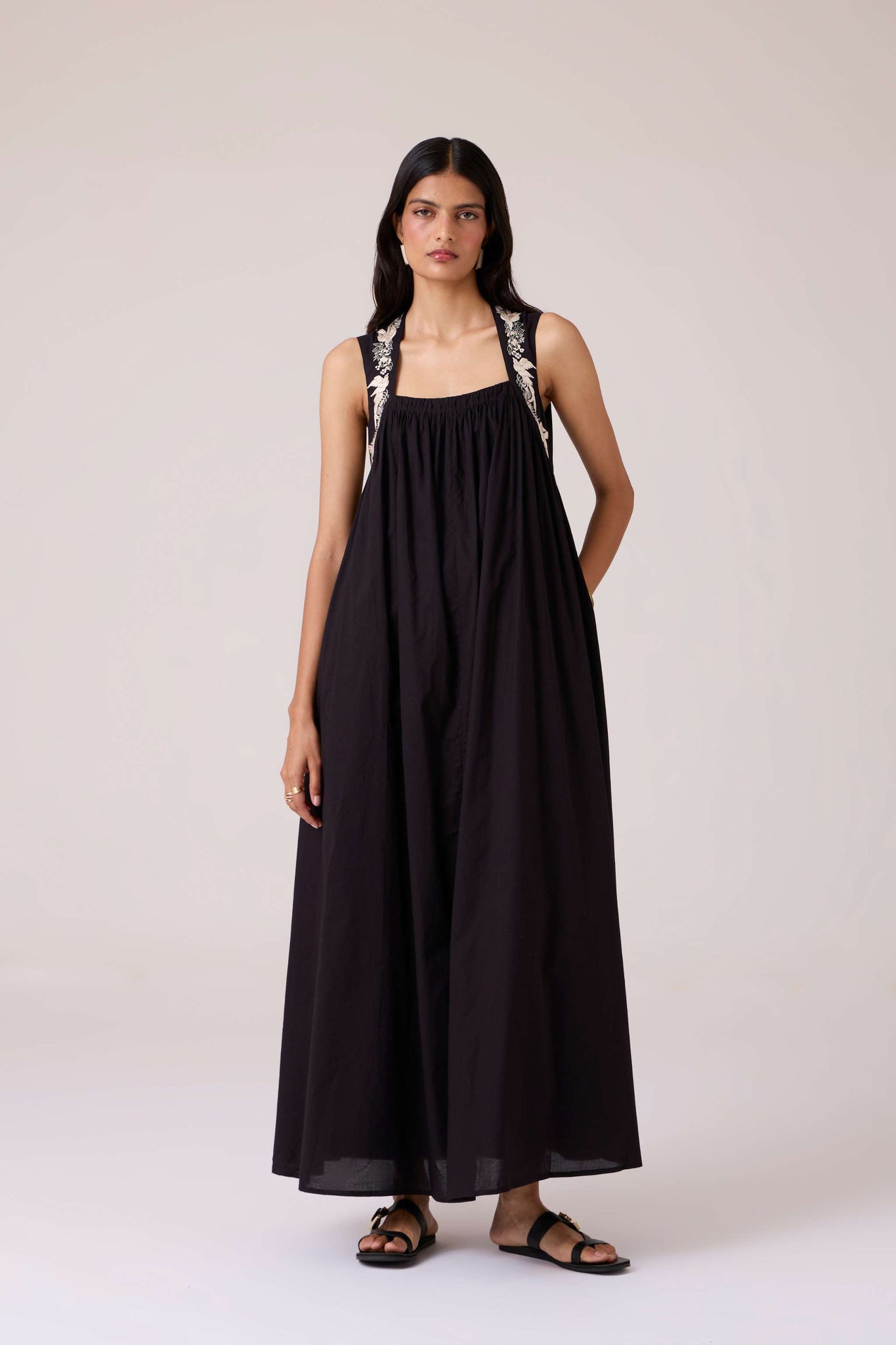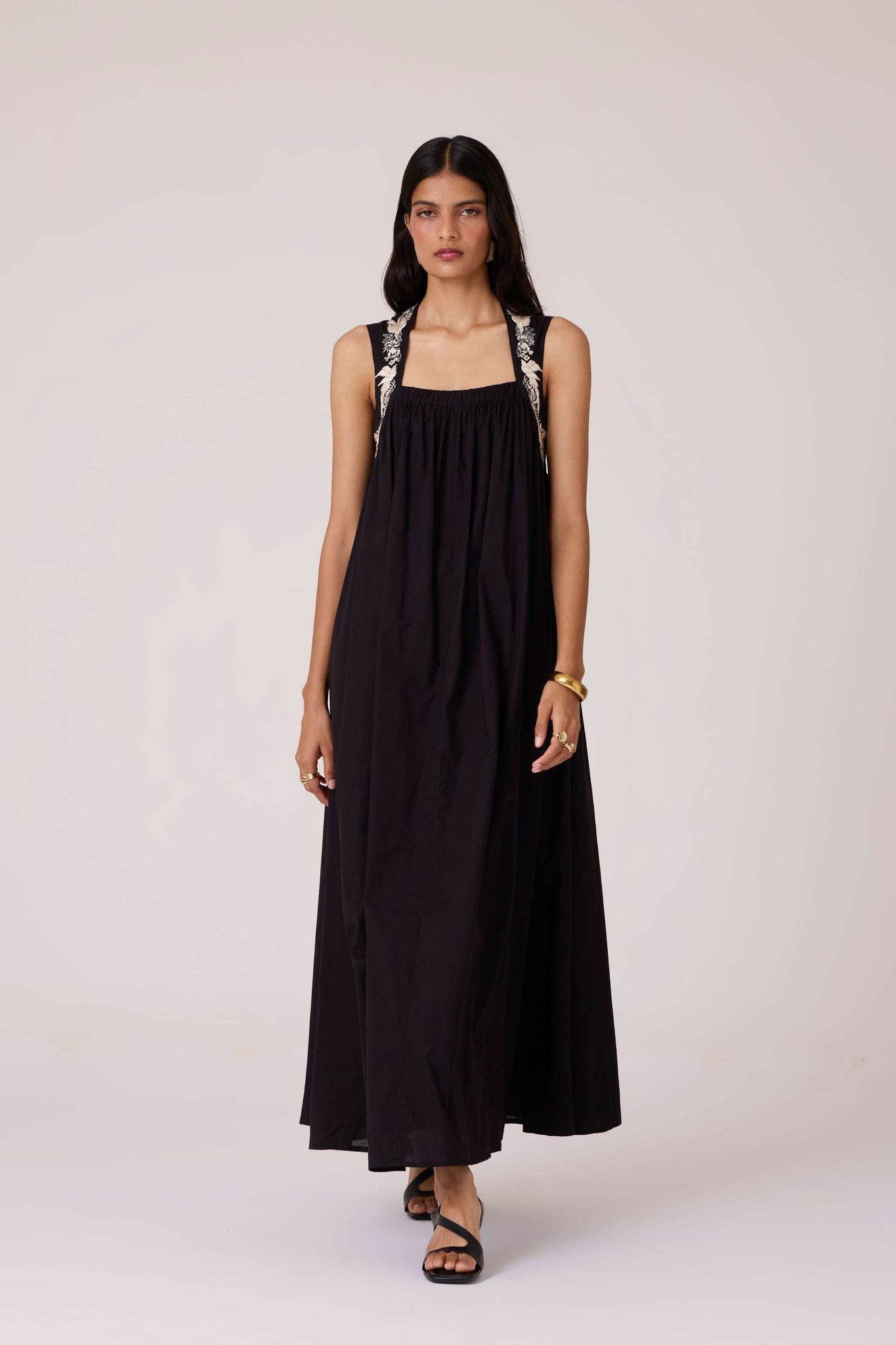 Bold yet restrained. A square neckline framed by embroidered straps, while the cut remains assuredly minimal.