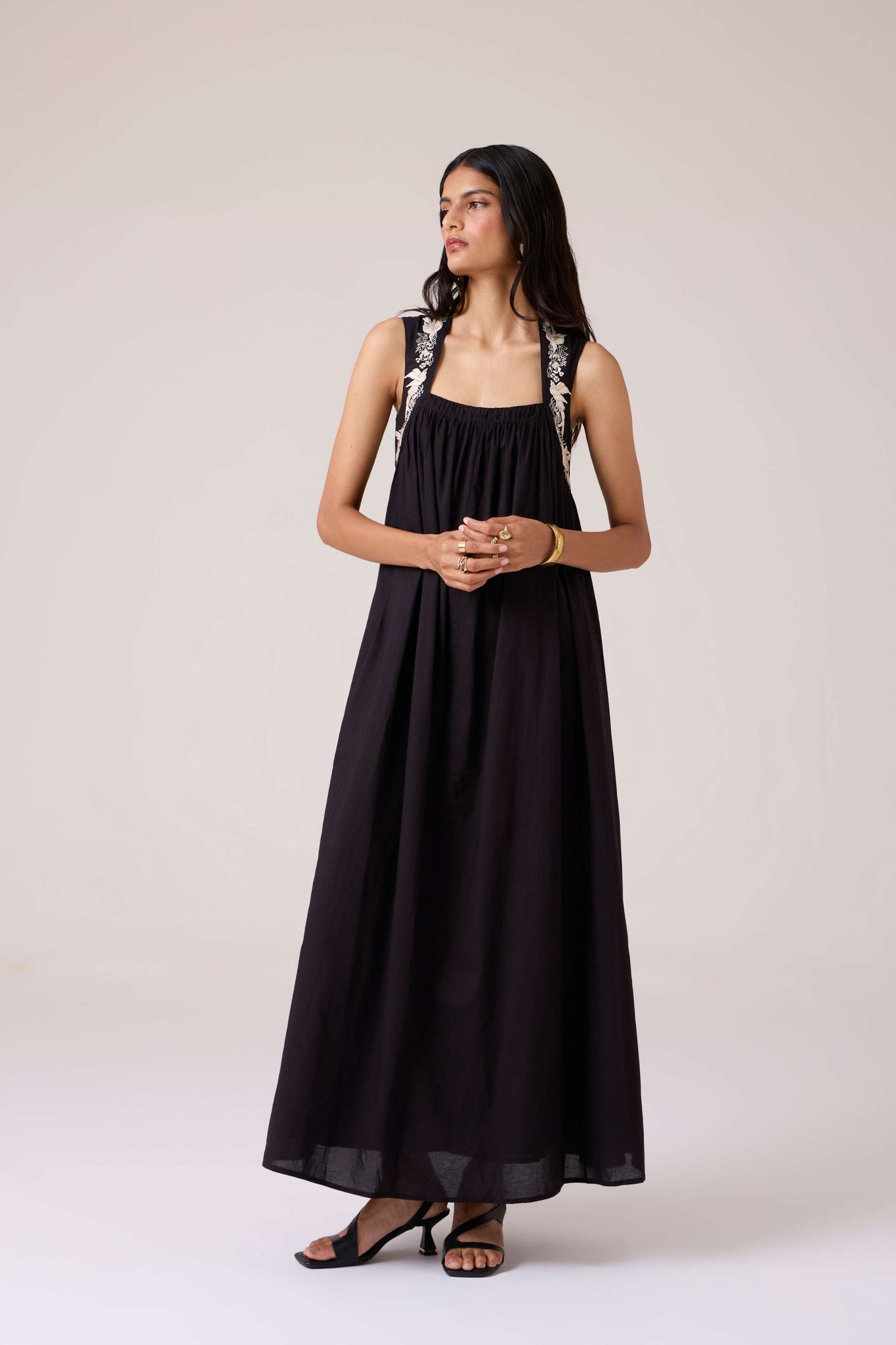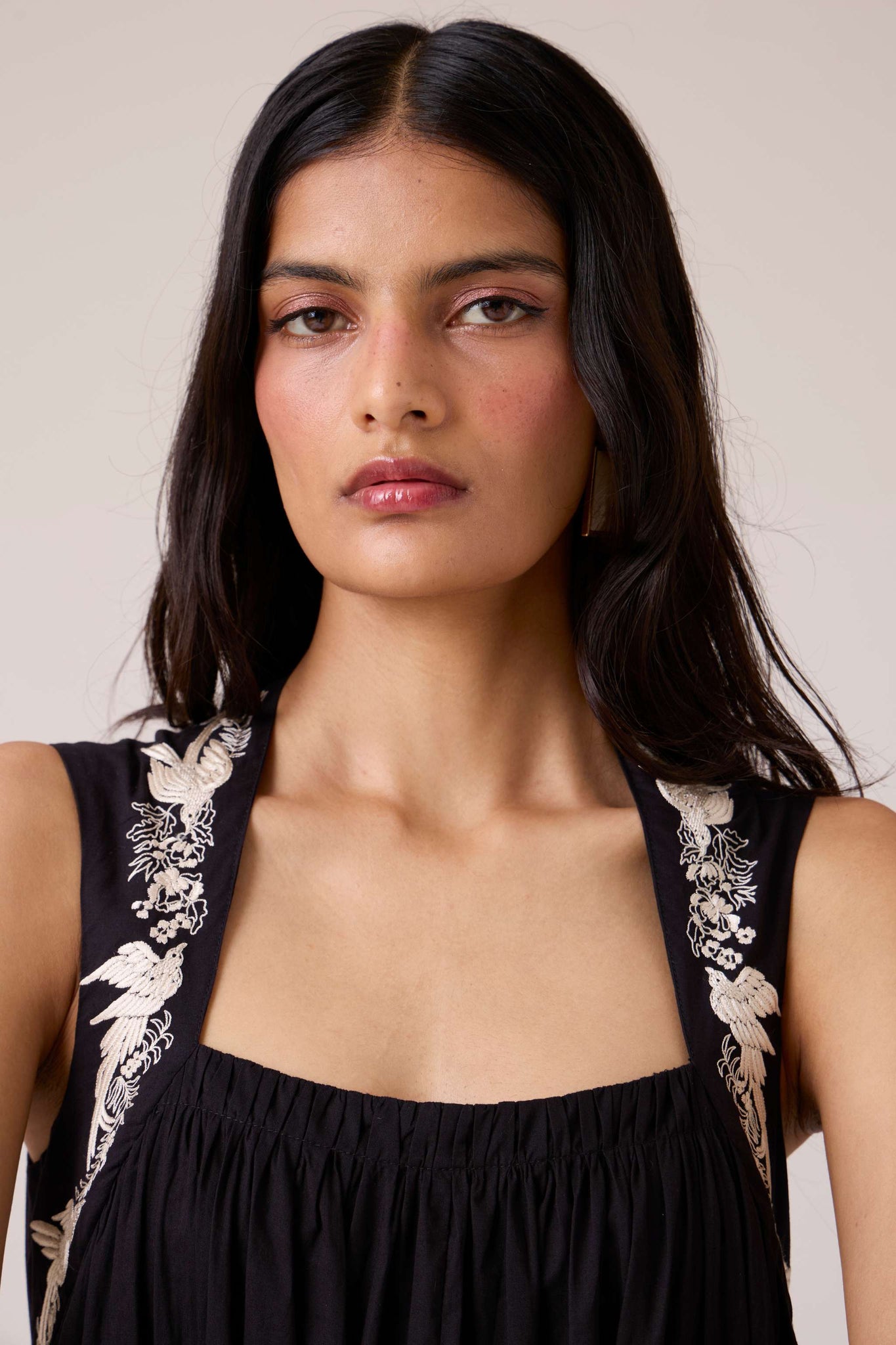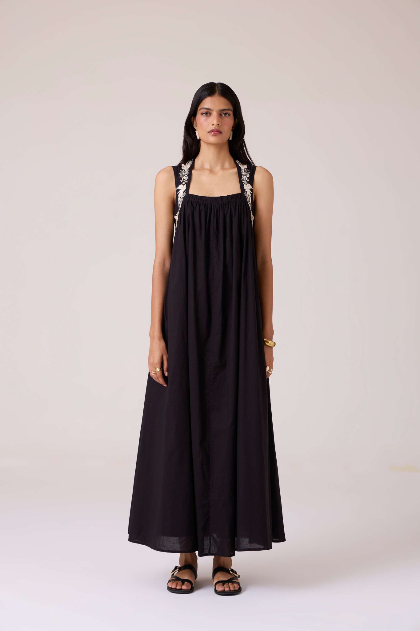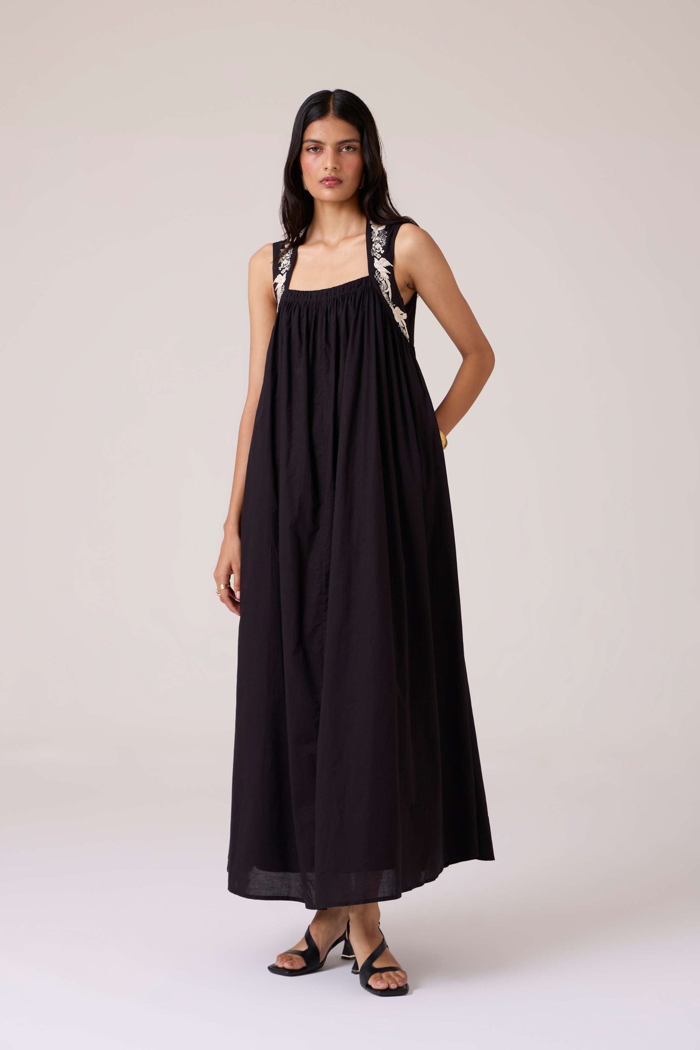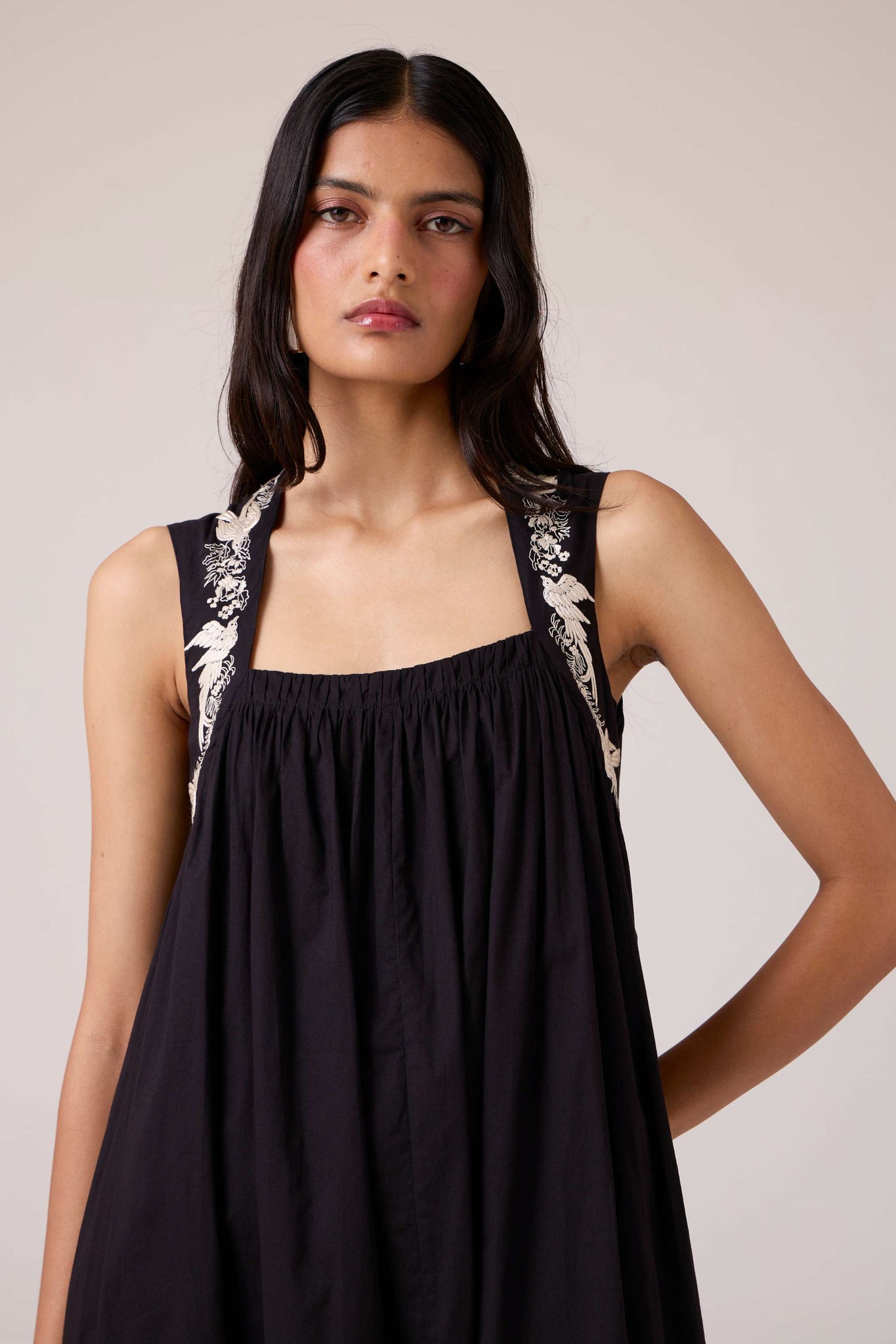 Bold yet restrained. A square neckline framed by embroidered straps, while the cut remains assuredly minimal.