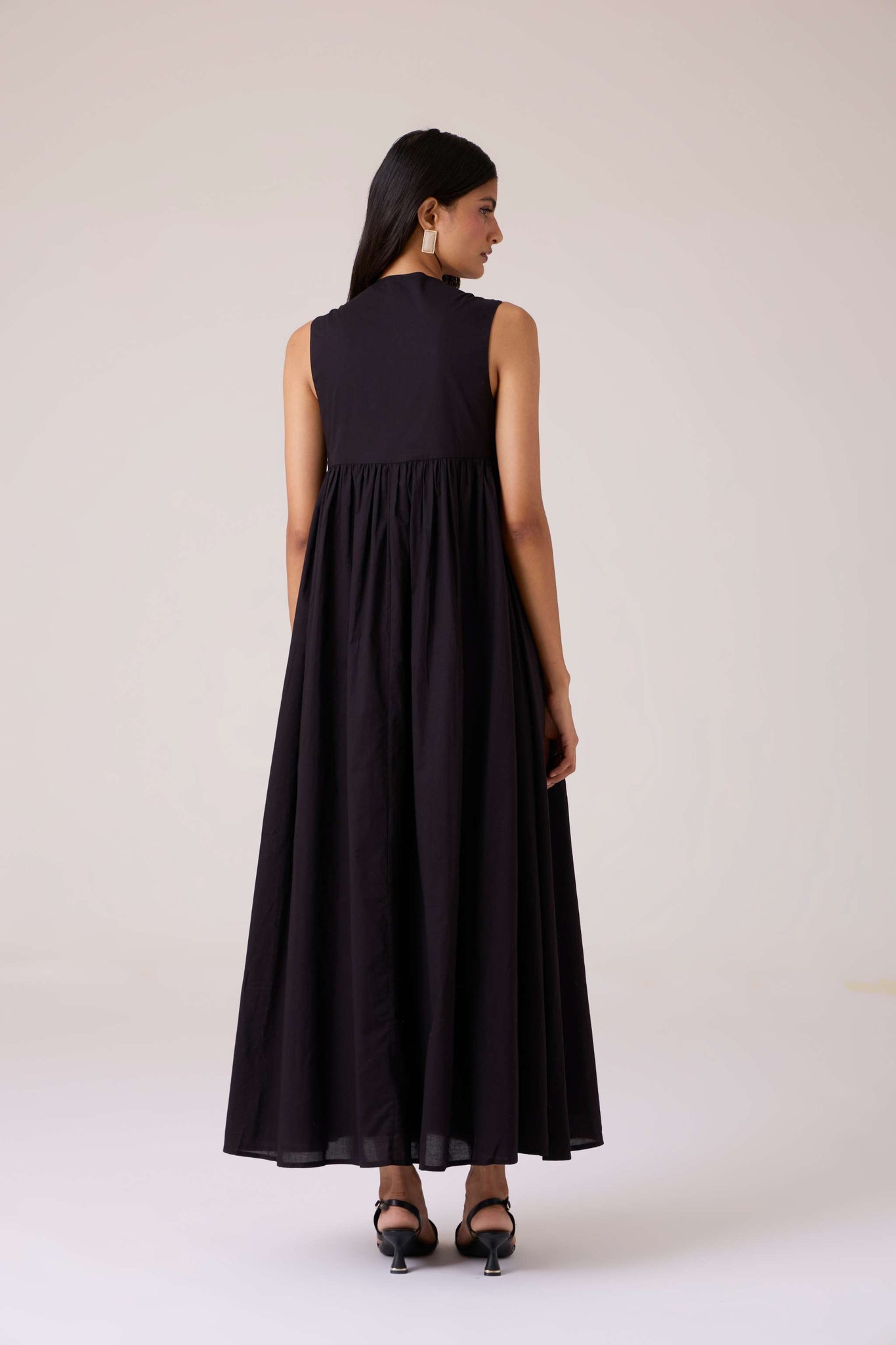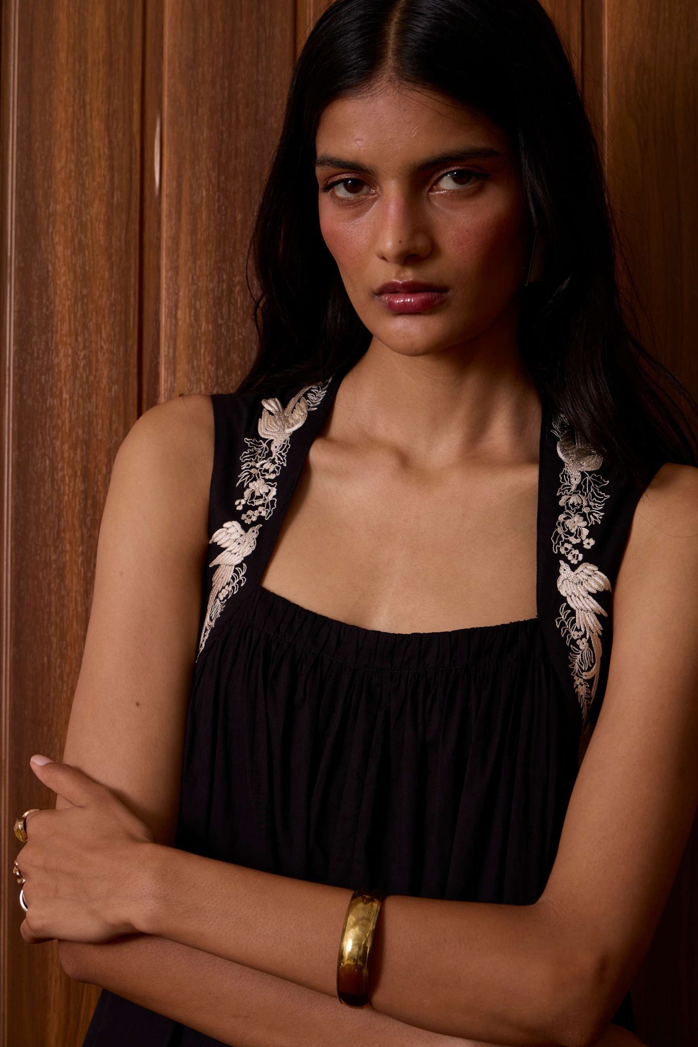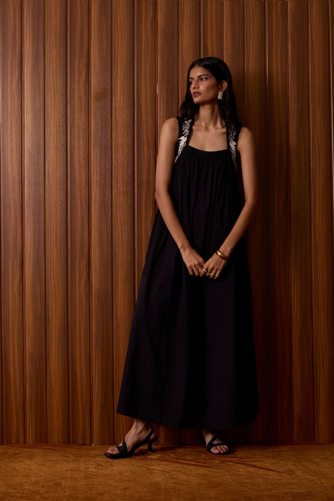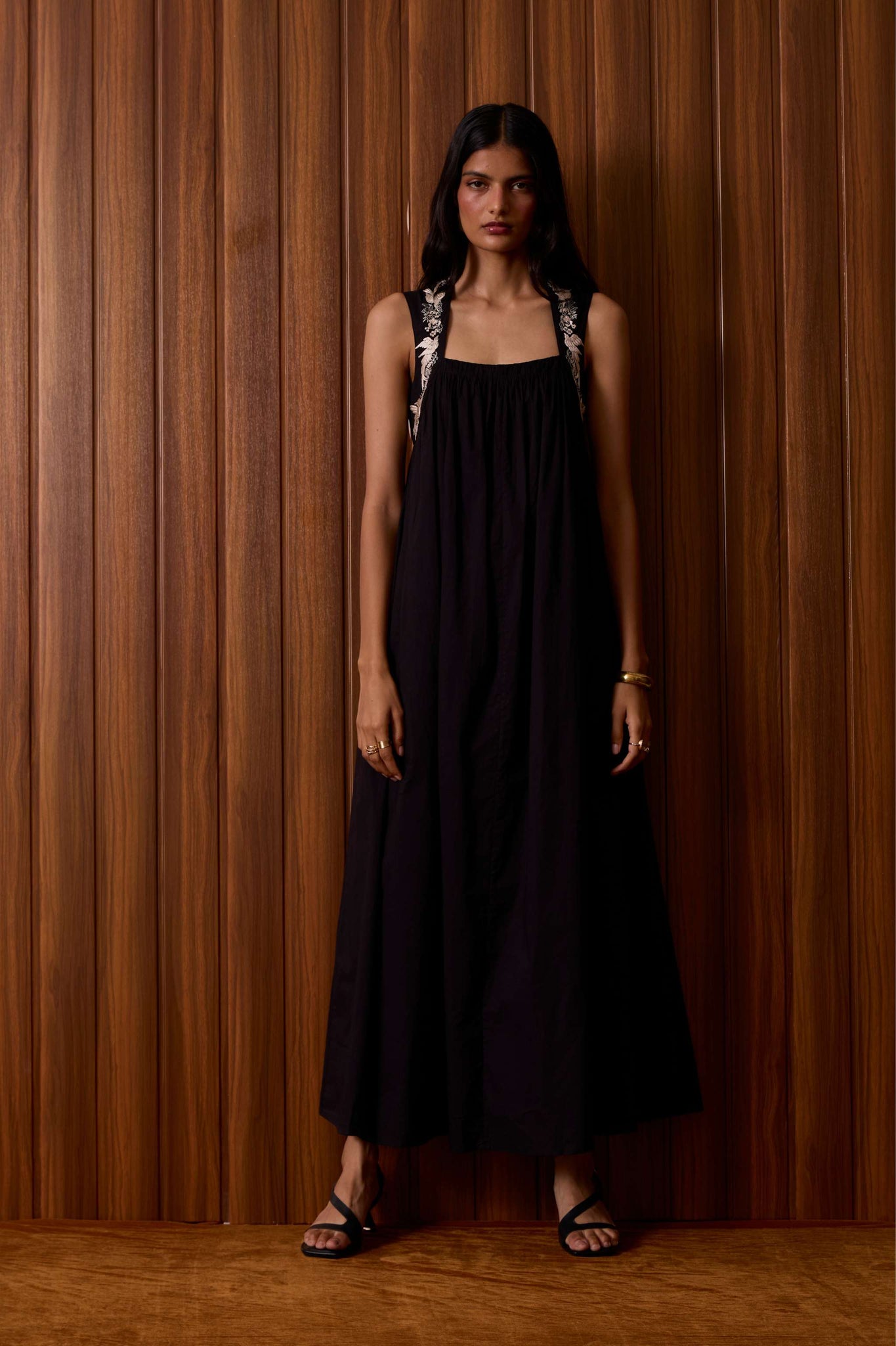 Bold yet restrained. A square neckline framed by embroidered straps, while the cut remains assuredly minimal.