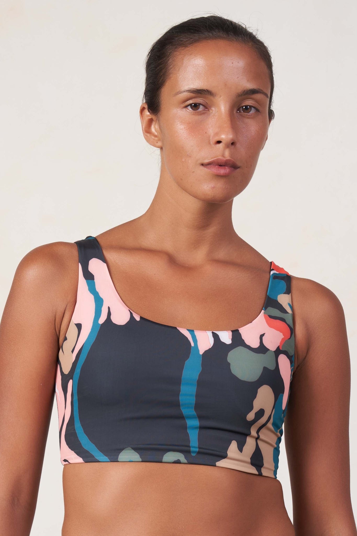 Swim top with square neck featuring bold straps. Removable padding.