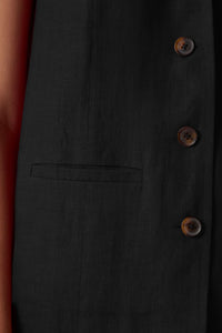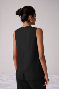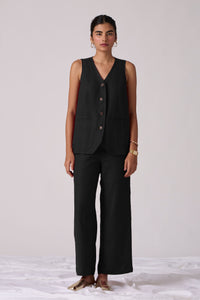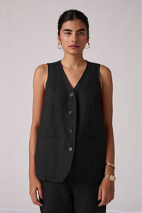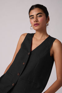 Sophisticated V-neck waistcoat crafted from linen cotton. Front button fastening. Welt pockets in the front. Back slit for easy fit on the hips. Recommended pairing with matching pants or your favourite denim.