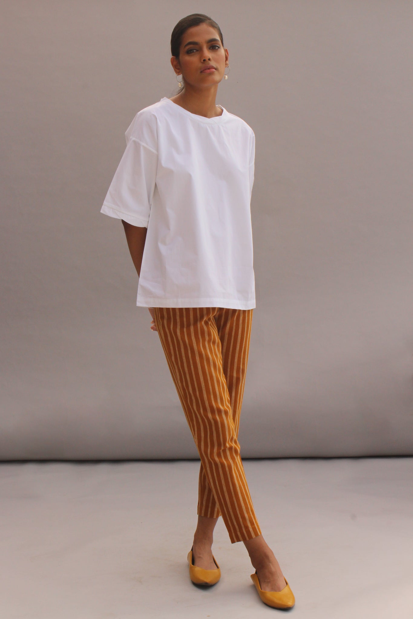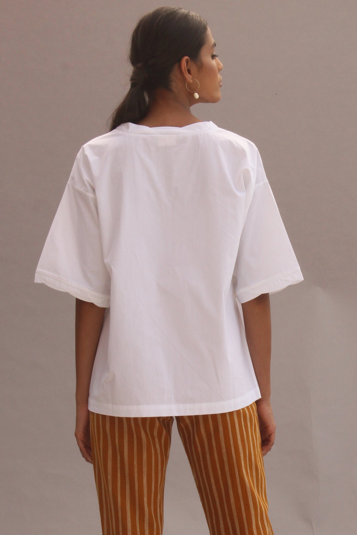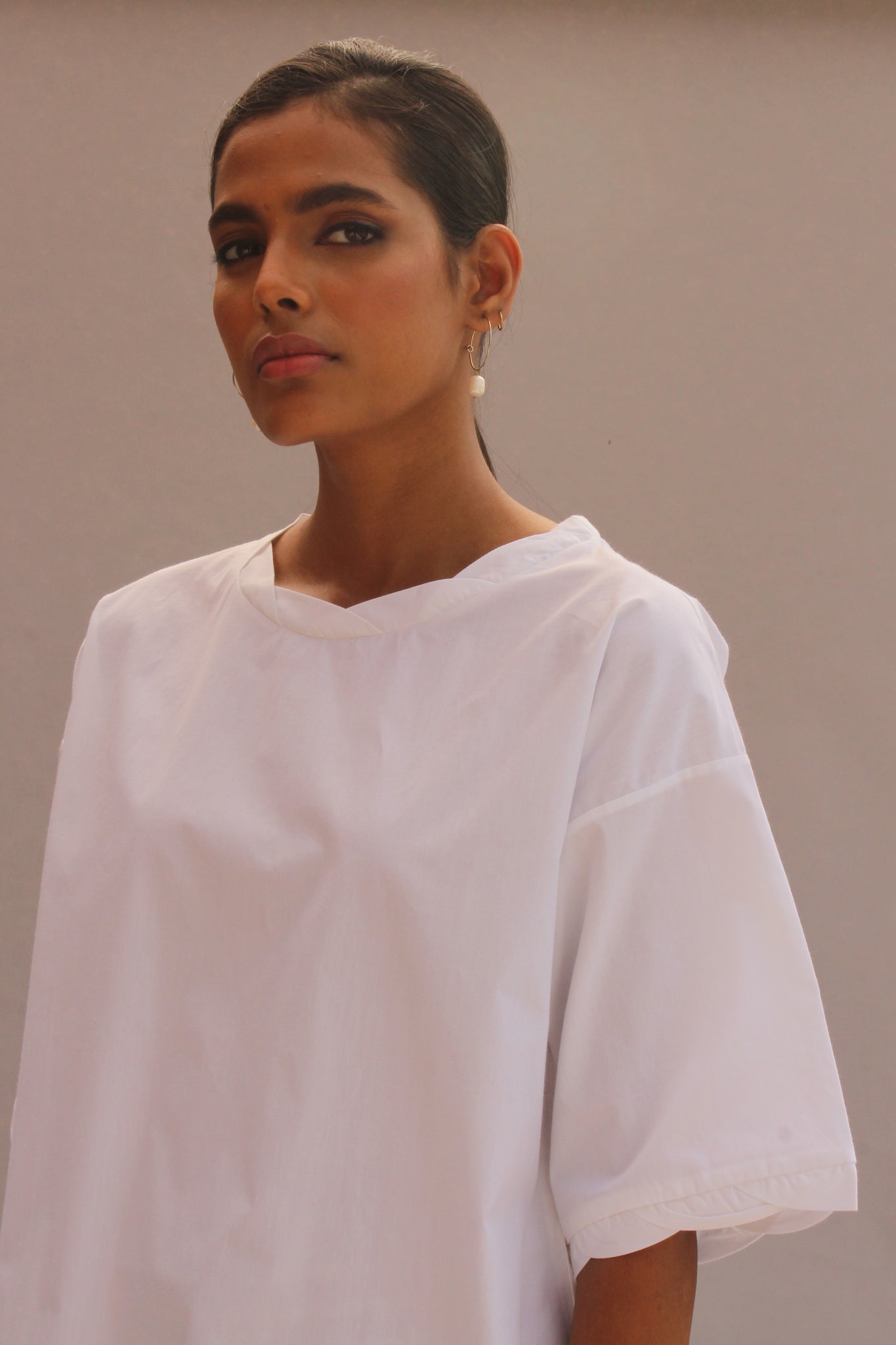 Dropped shoulders with short kimono sleeves. Delicately turned neckline and sleeve hem. Relaxed fit.