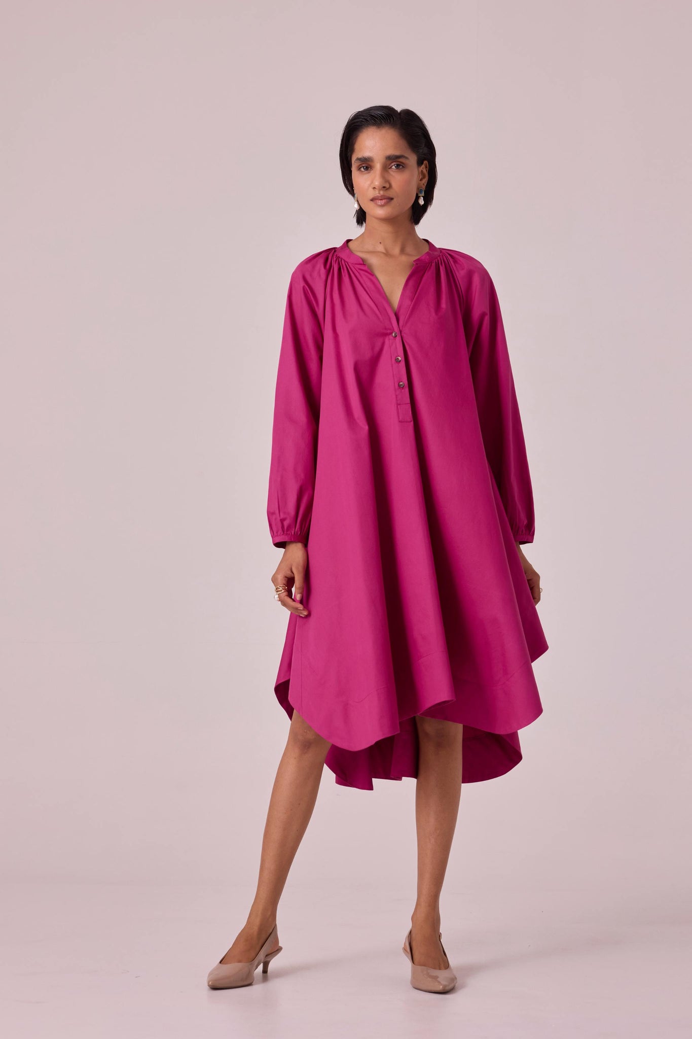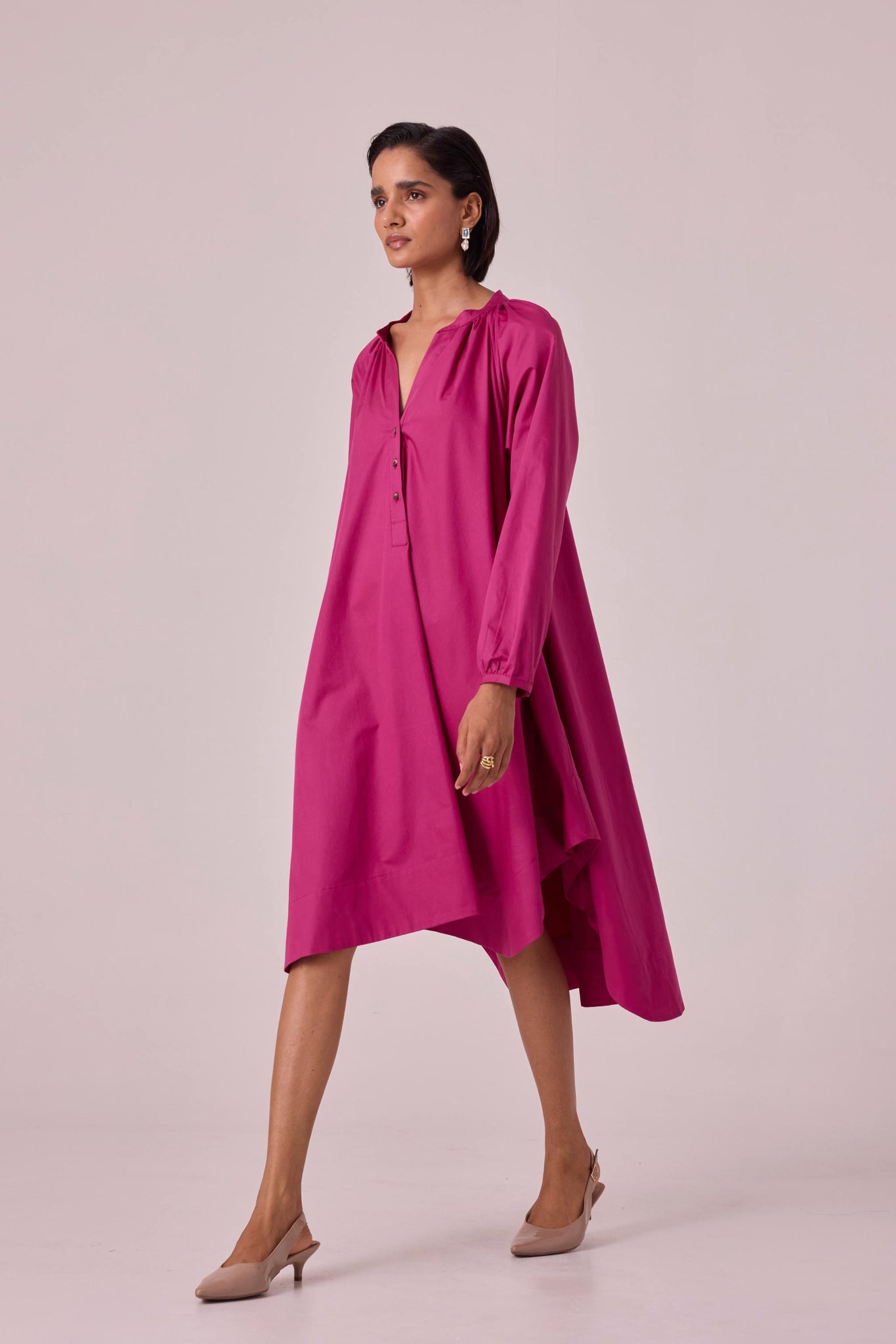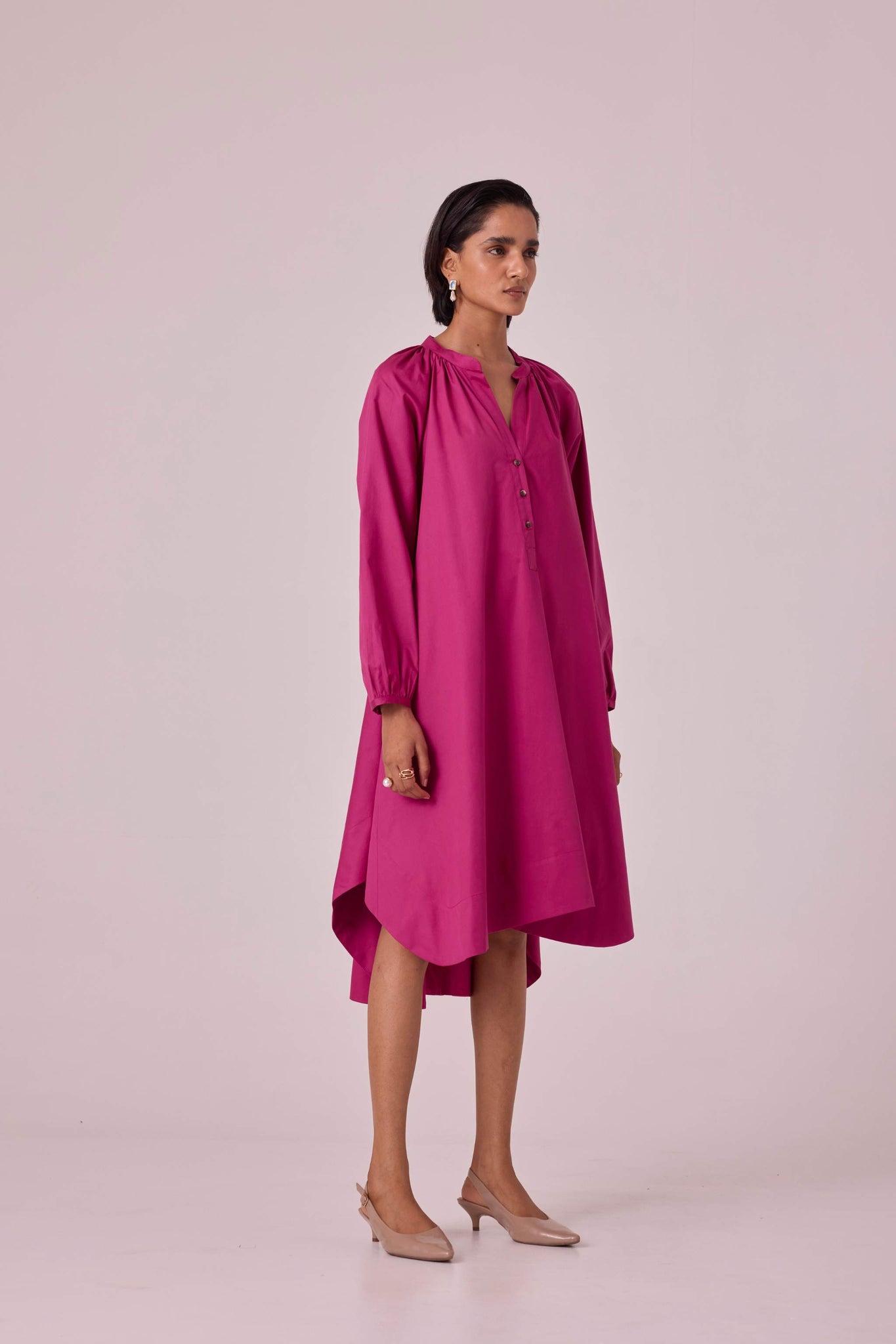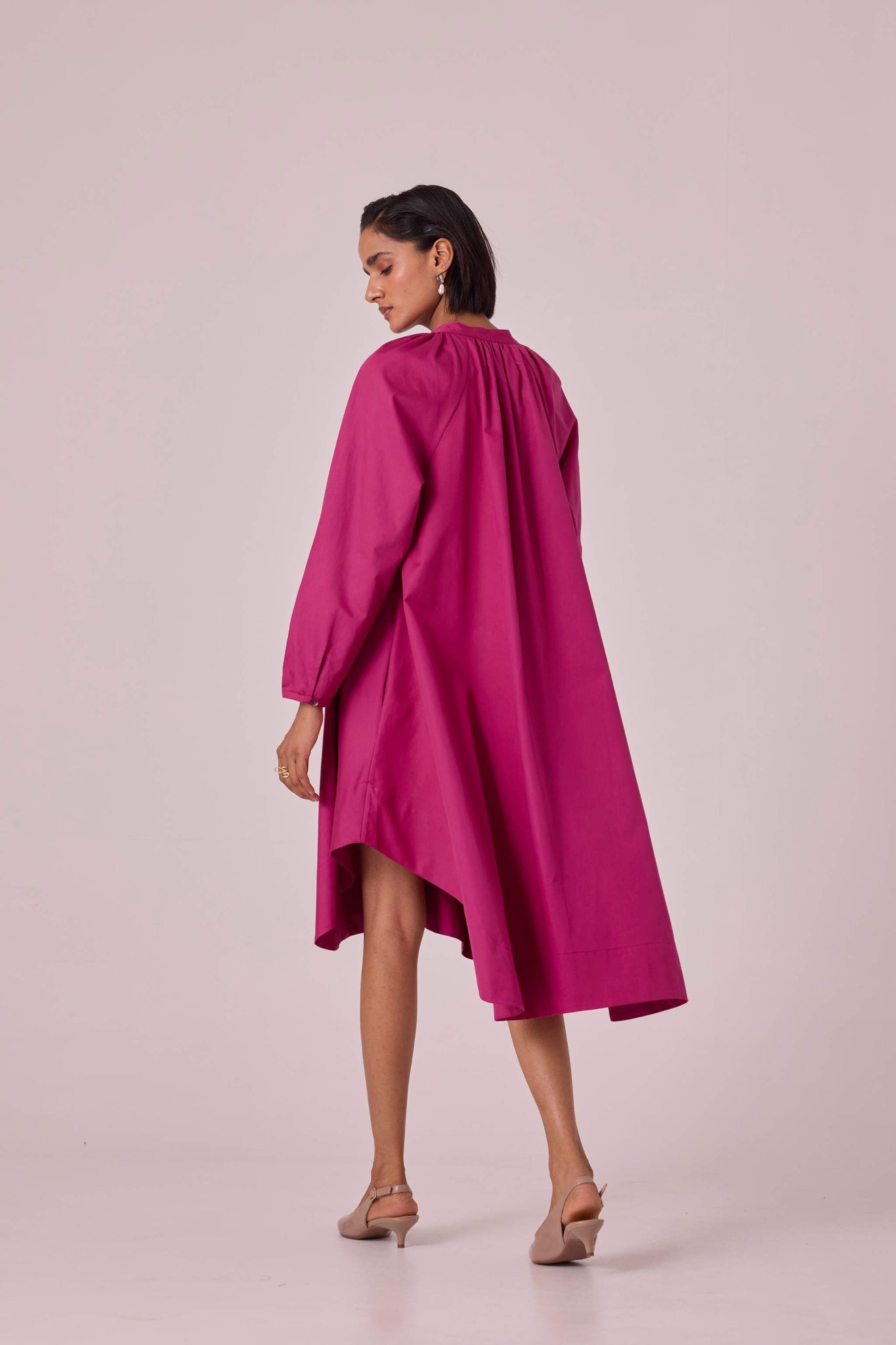 A-line dress in Giza Cotton. Bounteous flare. Flat-band collar with three button placket. Delicate gathers around the collar and cuff. Bold tail hem. In-seam pockets.