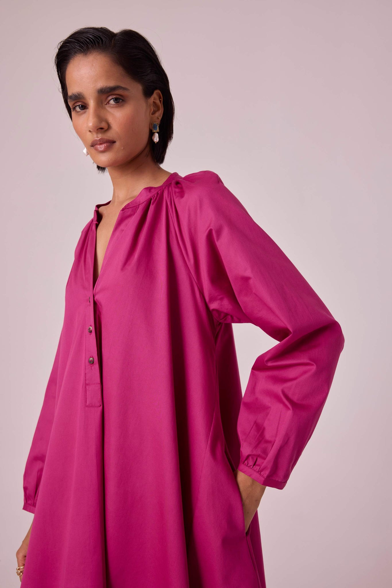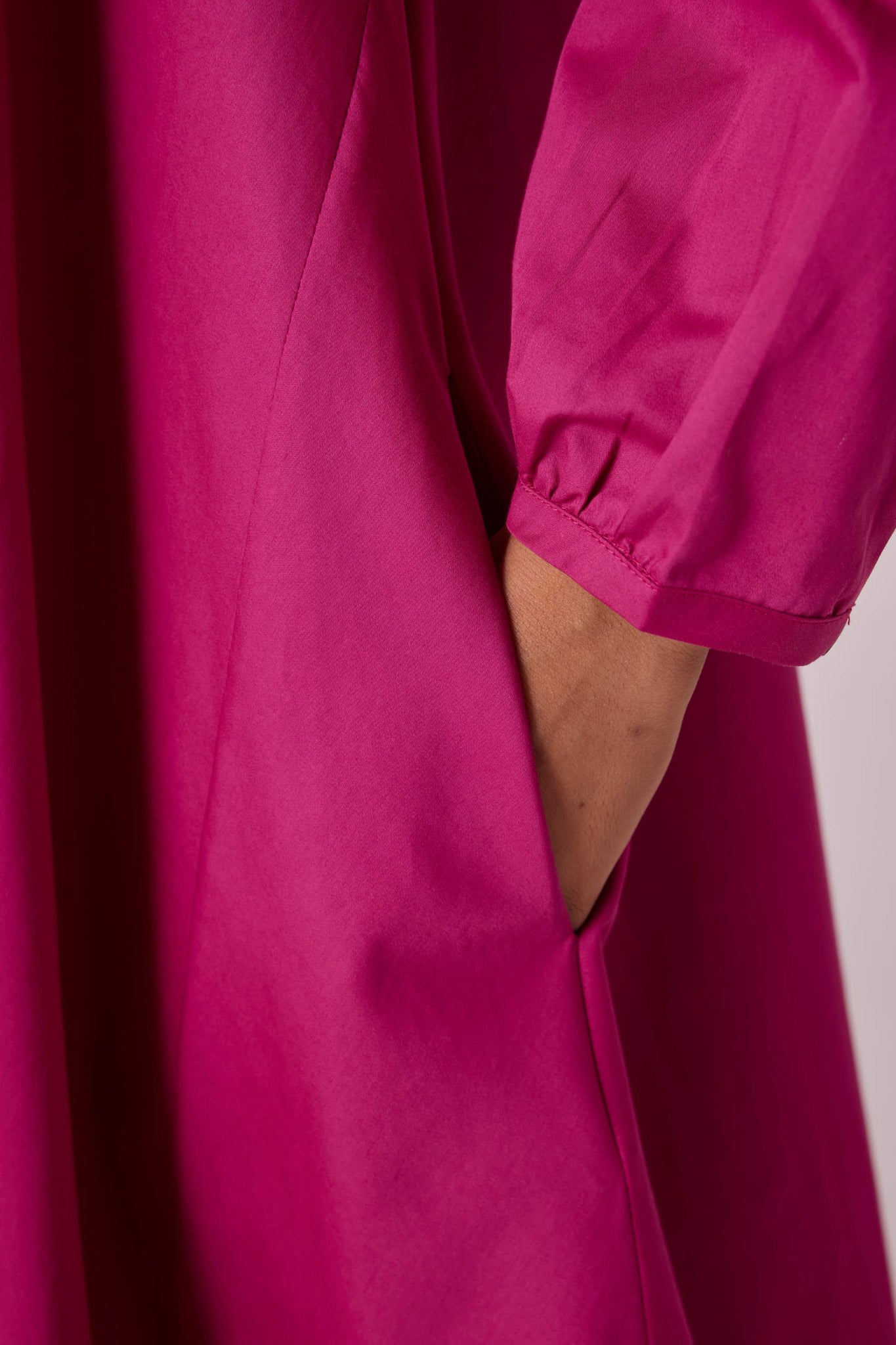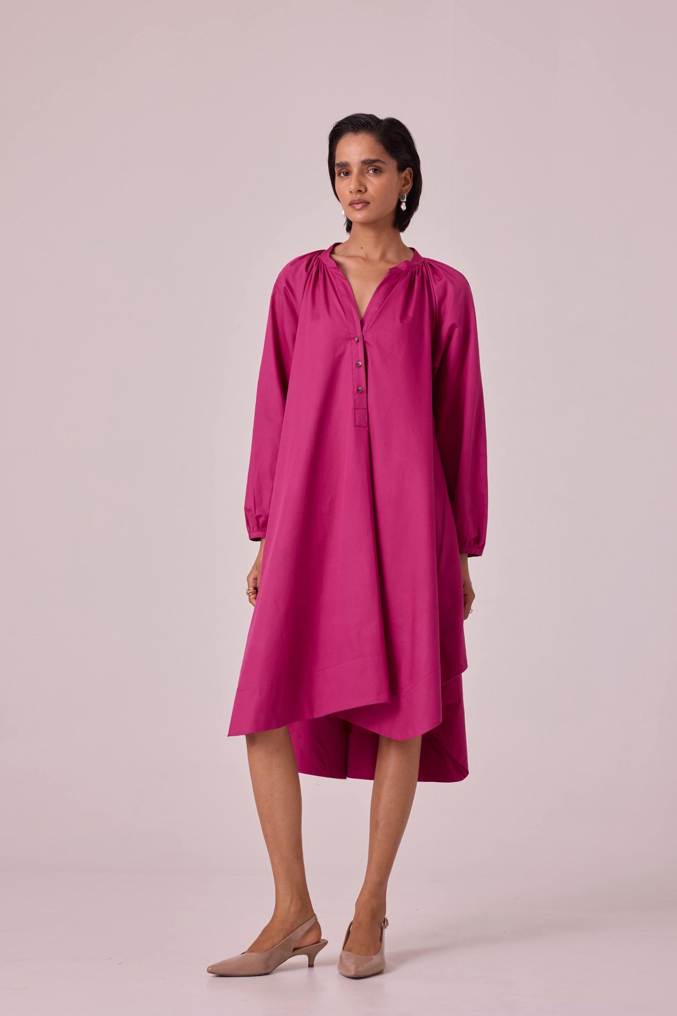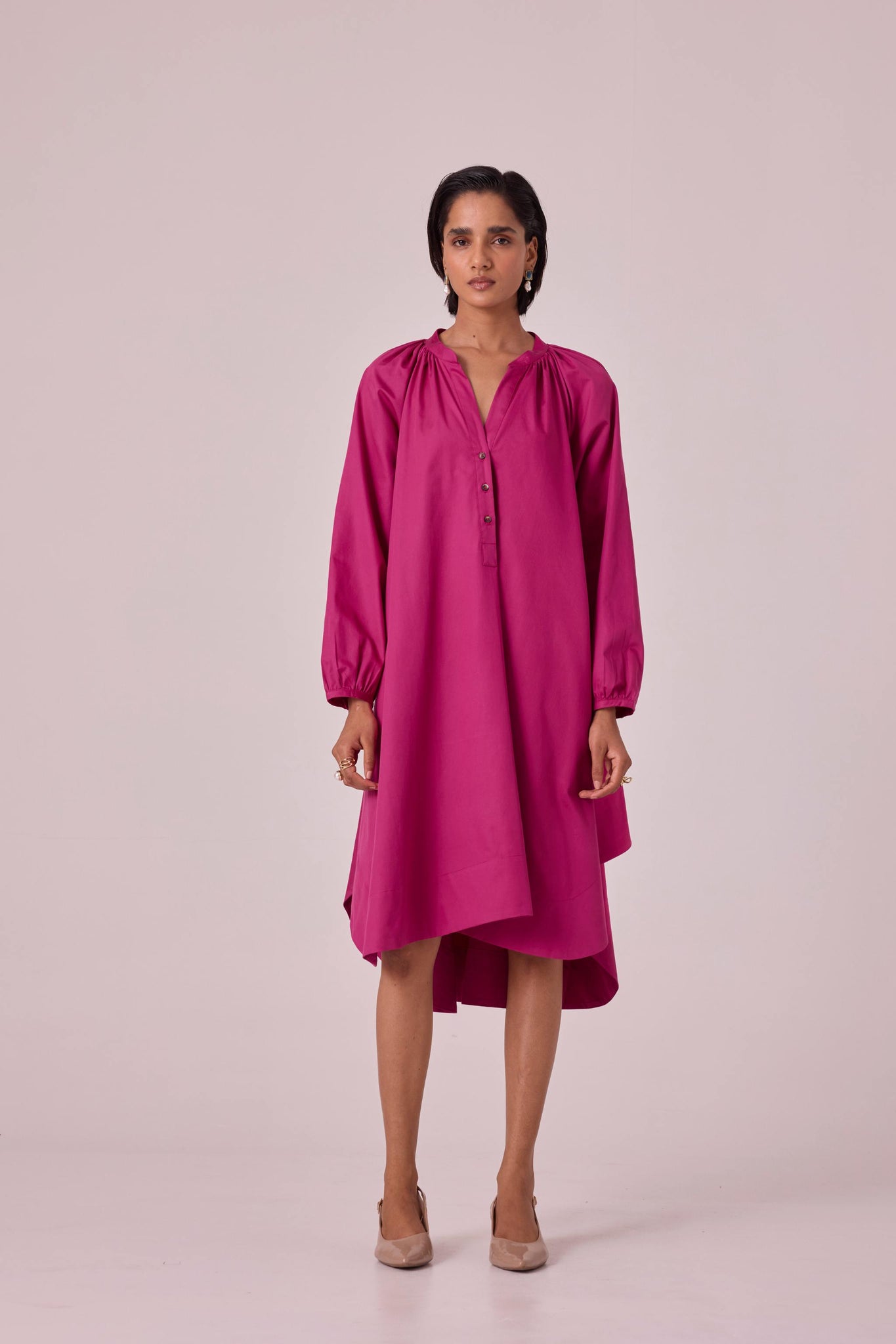 A-line dress in Giza Cotton. Bounteous flare. Flat-band collar with three button placket. Delicate gathers around the collar and cuff. Bold tail hem. In-seam pockets.