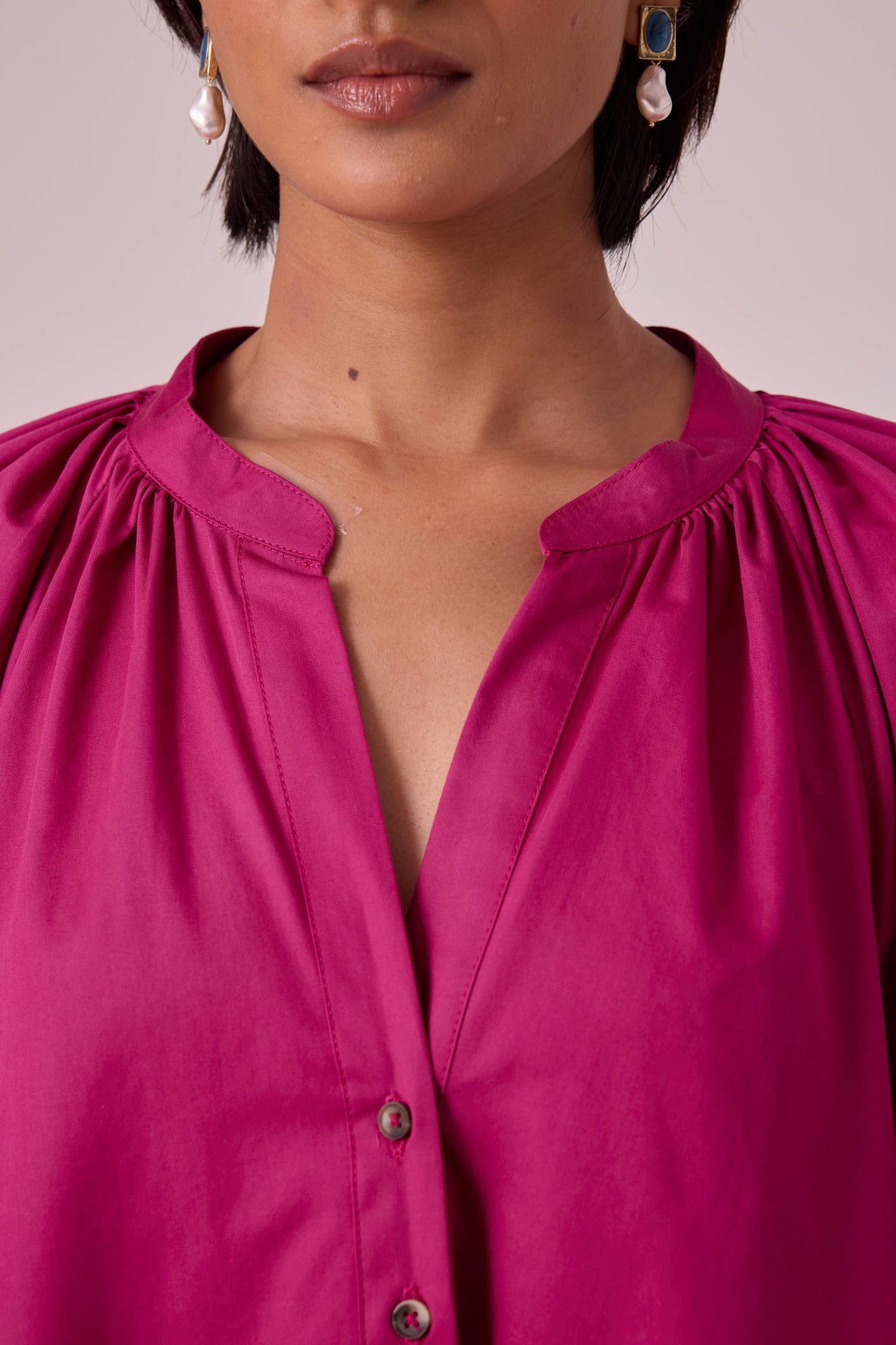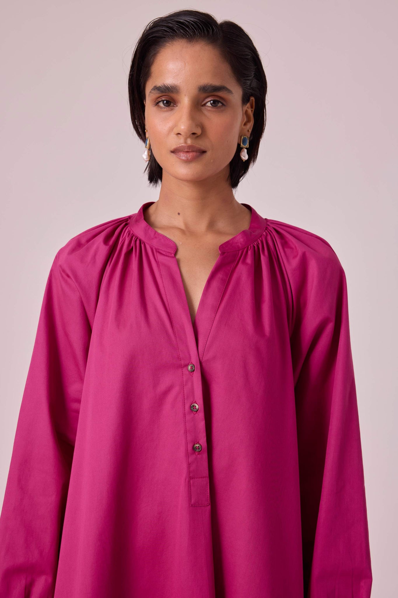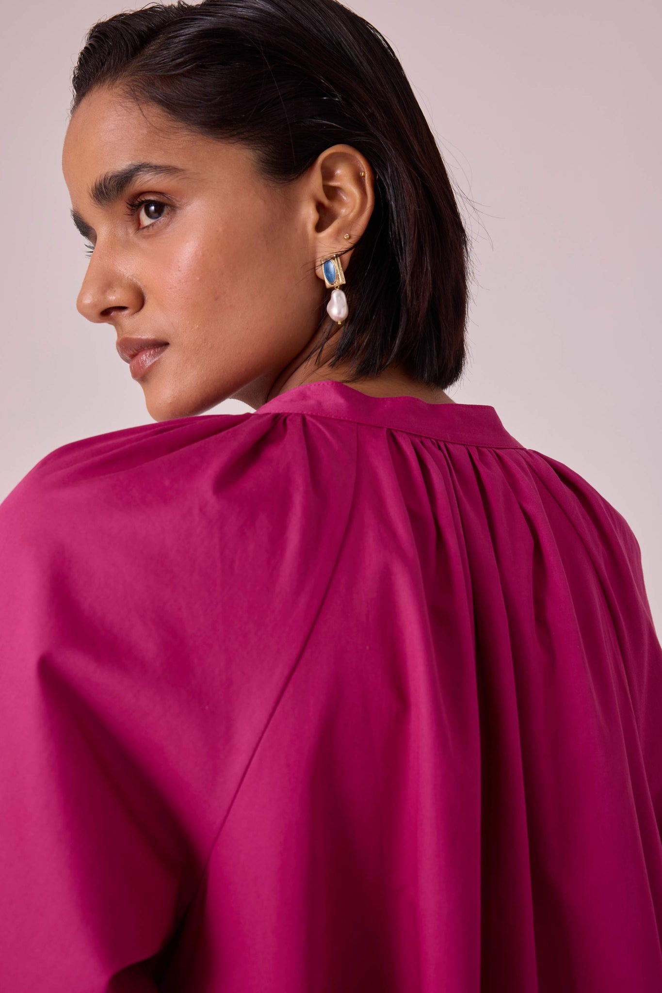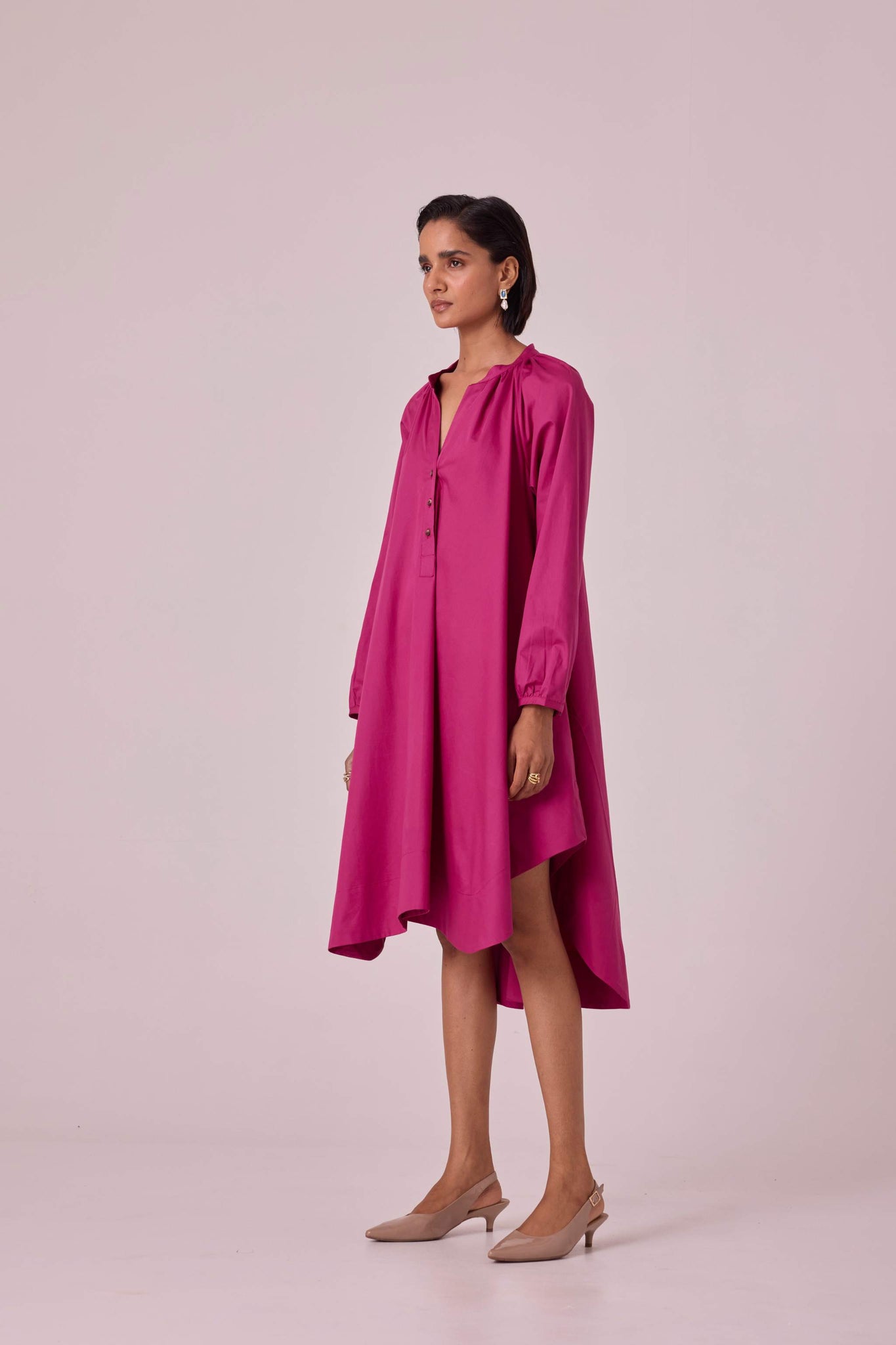 A-line dress in Giza Cotton. Bounteous flare. Flat-band collar with three button placket. Delicate gathers around the collar and cuff. Bold tail hem. In-seam pockets.